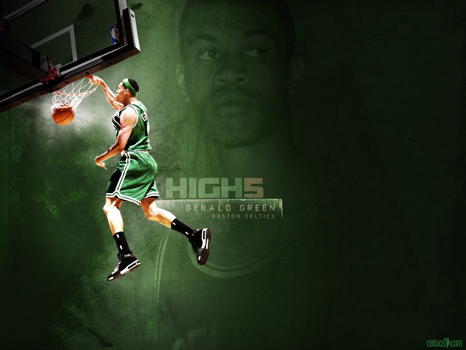 Description: A basketball player in a green uniform is jumping up to dunk the ball in the air with his right hand.