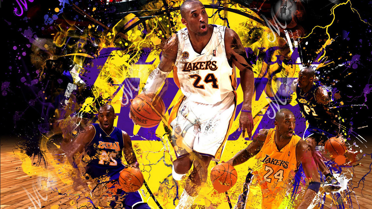 Description: A basketball player with a number on his uniform and a basketball in the air with a lot of paint splatters around him.