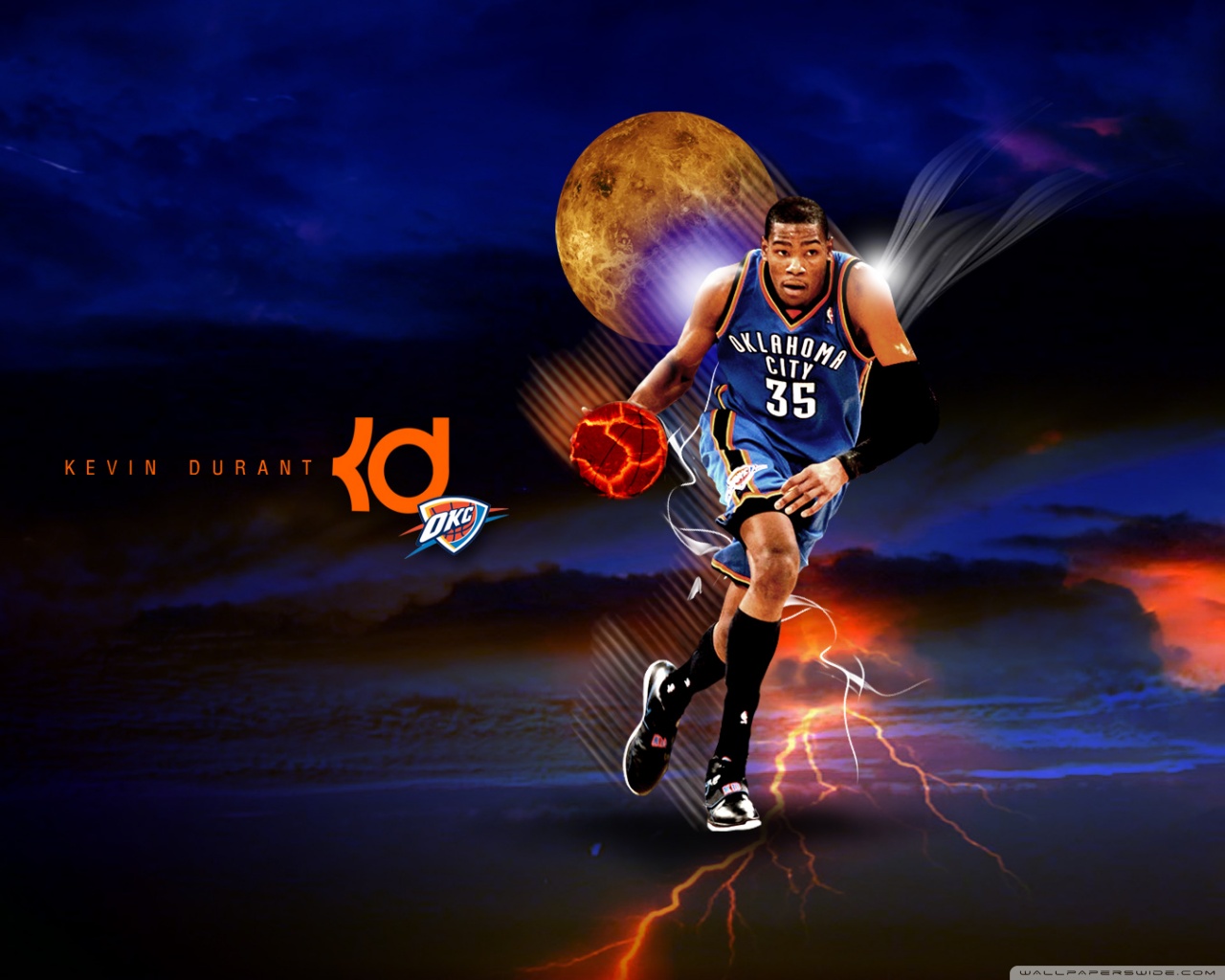 Description: A basketball player is running with a ball in his hand and lightning in the background with a full moon.