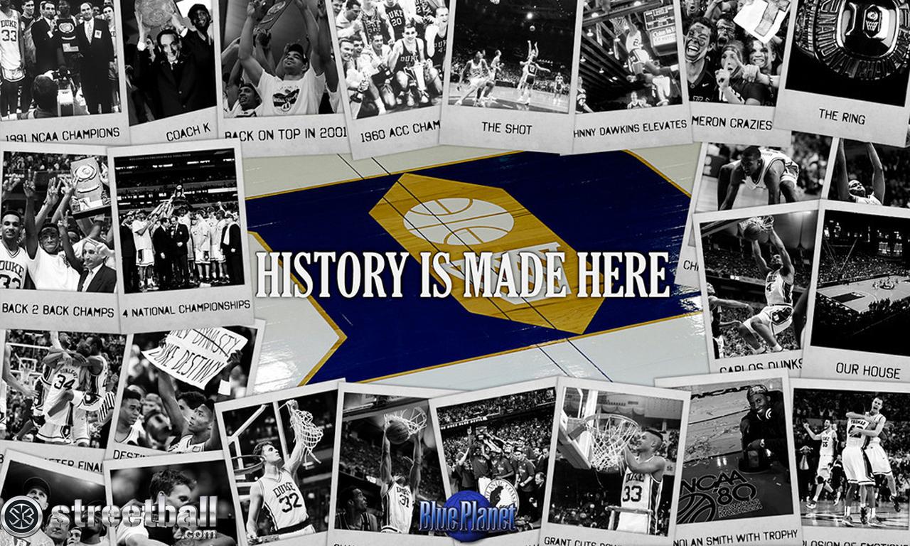 Description: A collage of photos of basketball players and their names on a wall with a message that reads history is made here.