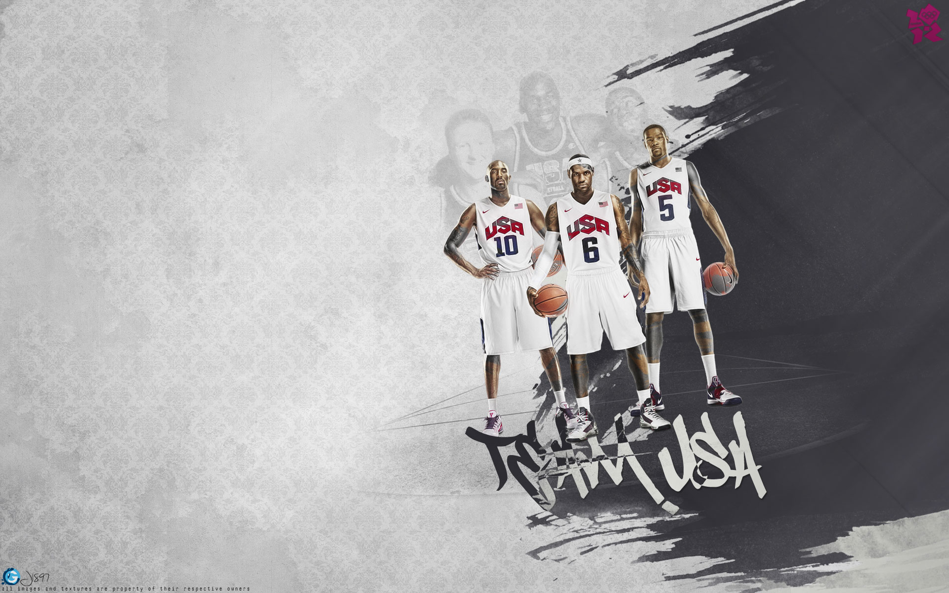 Description: A group of basketball players standing next to each other on a wall with a black and white background and a pink and white design.