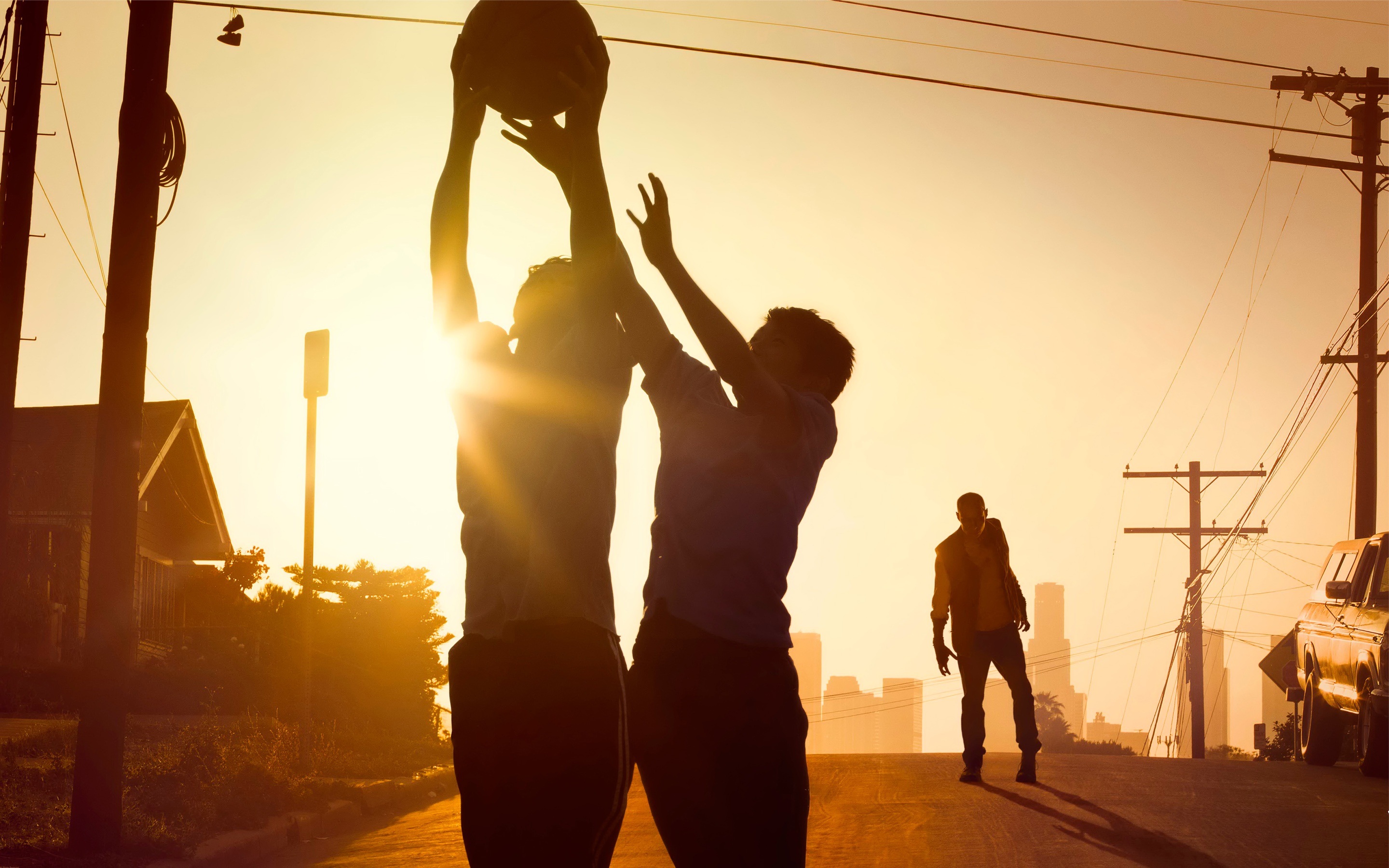 Description: Two people playing basketball in the street at sunset or dawn with the sun setting behind them and a person walking on the street.