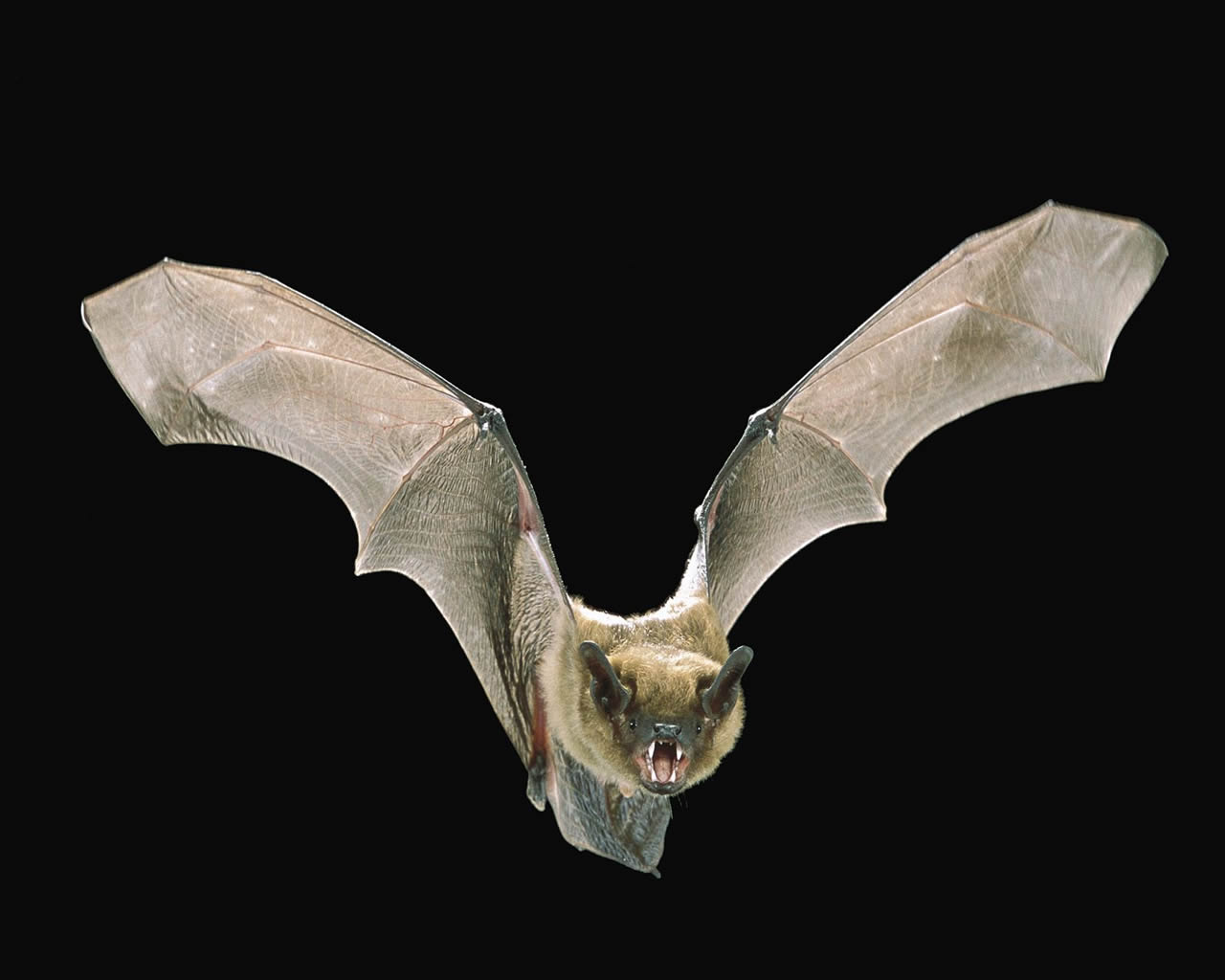 Description: A bat flying in the air with its wings spread wide open and it's mouth open and it's teeth wide open.