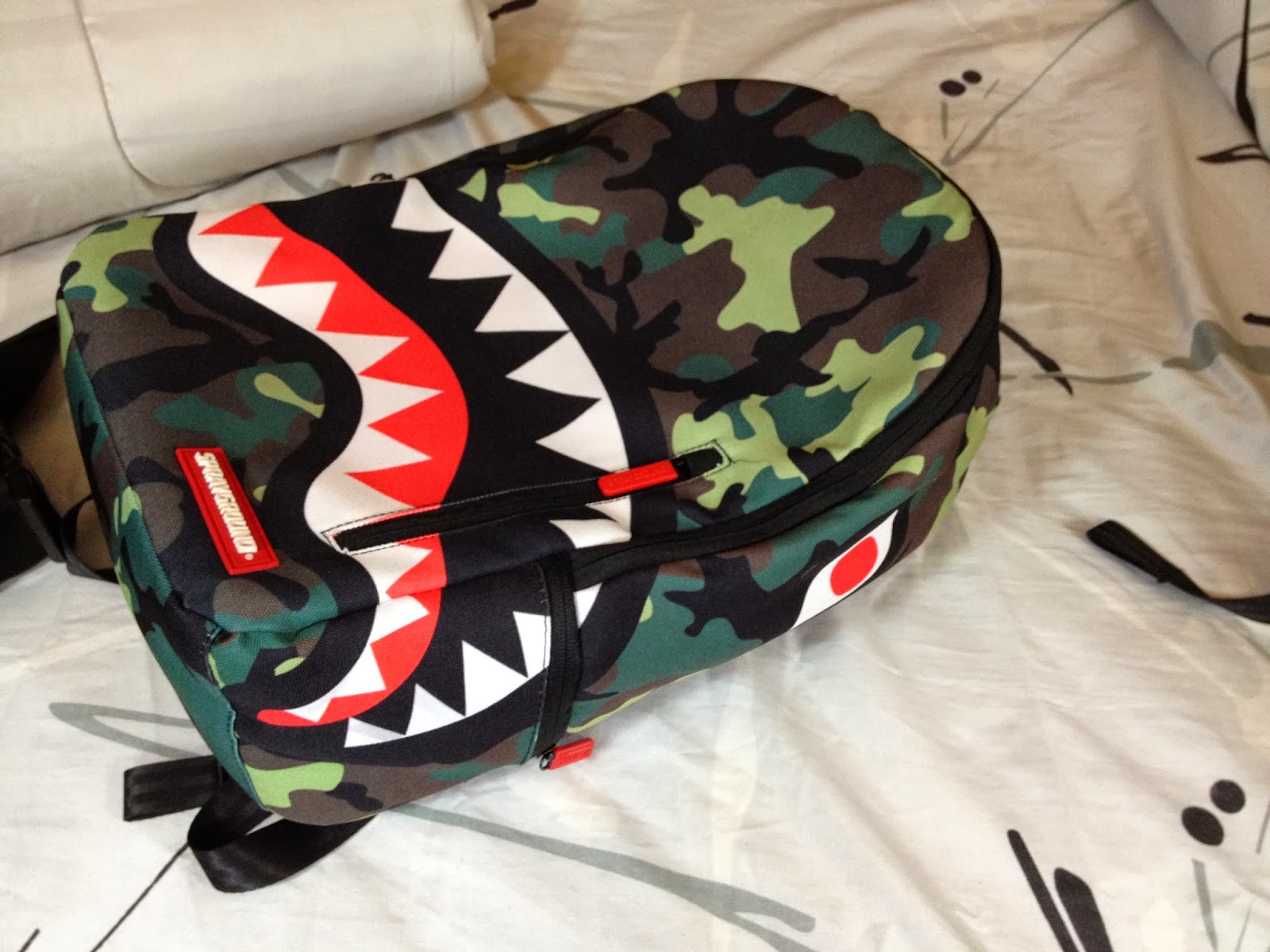 Description: A bathing bag with a shark mouth on it and a camera in the background on a bed with a sheet.