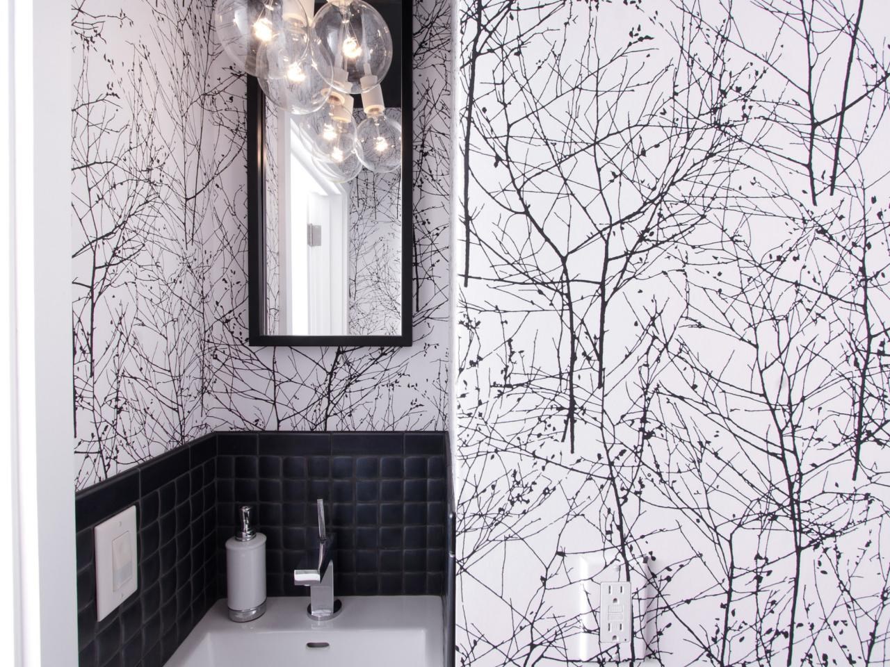 Description: A bathroom with a mirror and a sink in it with a black and white wallpaper and a black and white tiled wall.