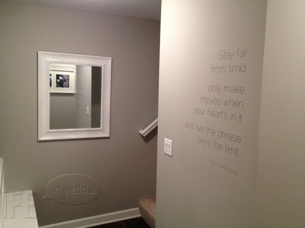 Description: A bathroom with a mirror and a white framed picture on the wall and a quote on the wall above it.