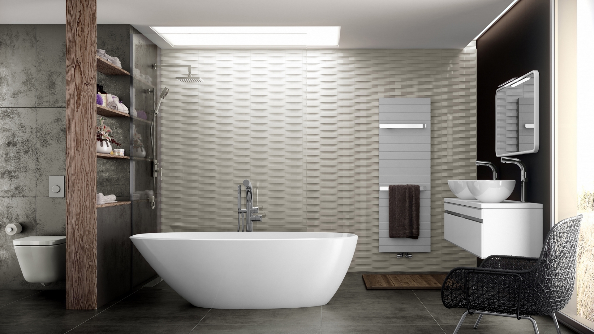 Description: A bathroom with a large white tub and a toilet and sink in it and a shelf with towels on it.