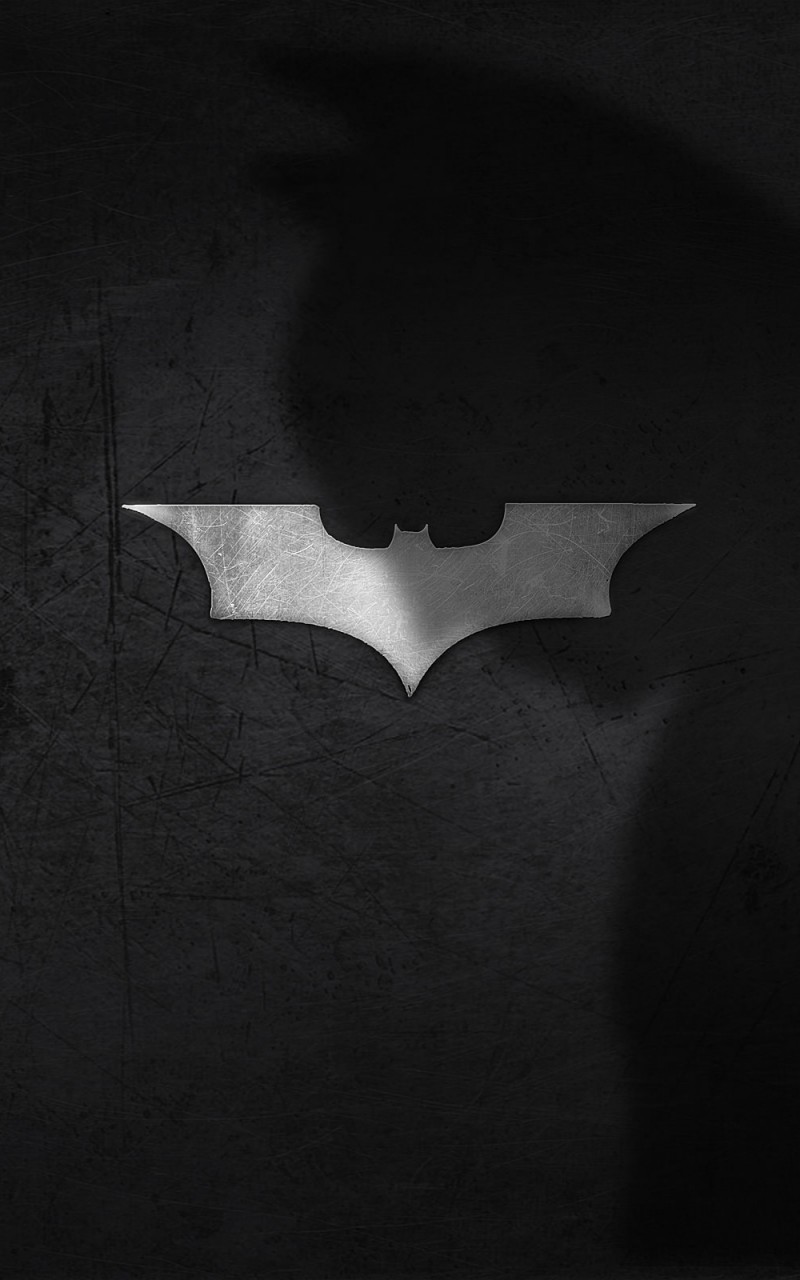 Description: A batman logo is shown on a wall in the dark room of a building with a shadow of a person.