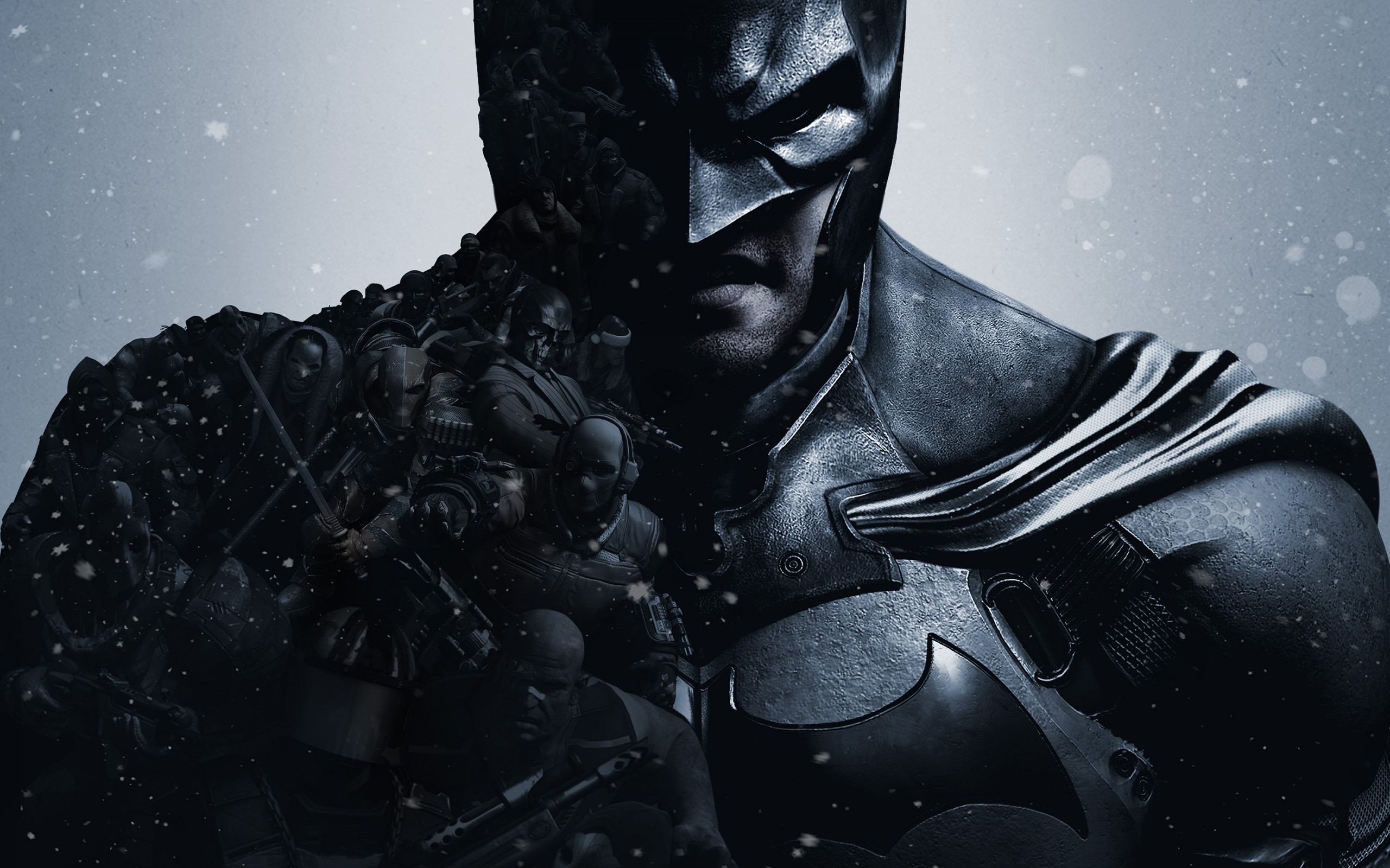 Description: A batman character standing in the snow with his arm around his chest and a bat on his shoulder.