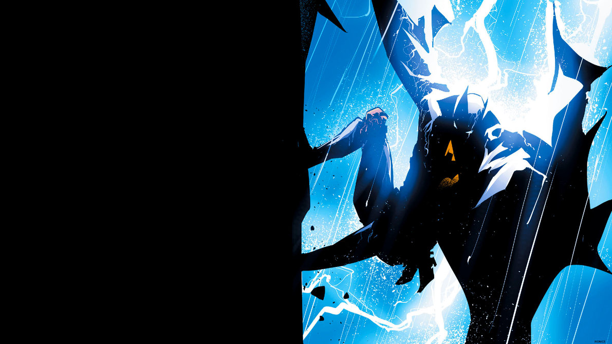 Description: A batman character is standing in the rain with his arms outstretched and his head tilted back to the side.