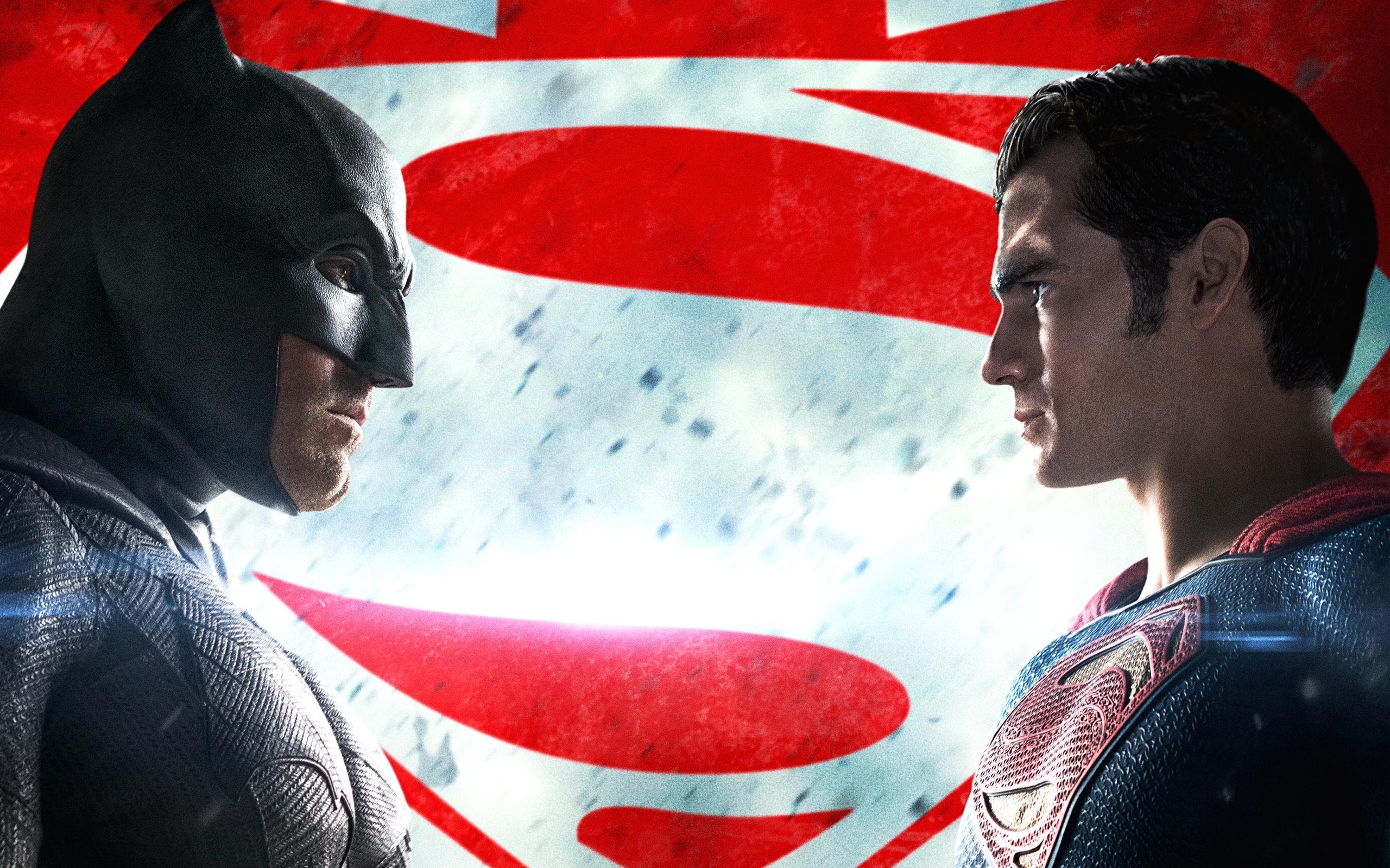 Description: Two men in batman costumes facing each other in front of a superman symbol background with a red and white background.