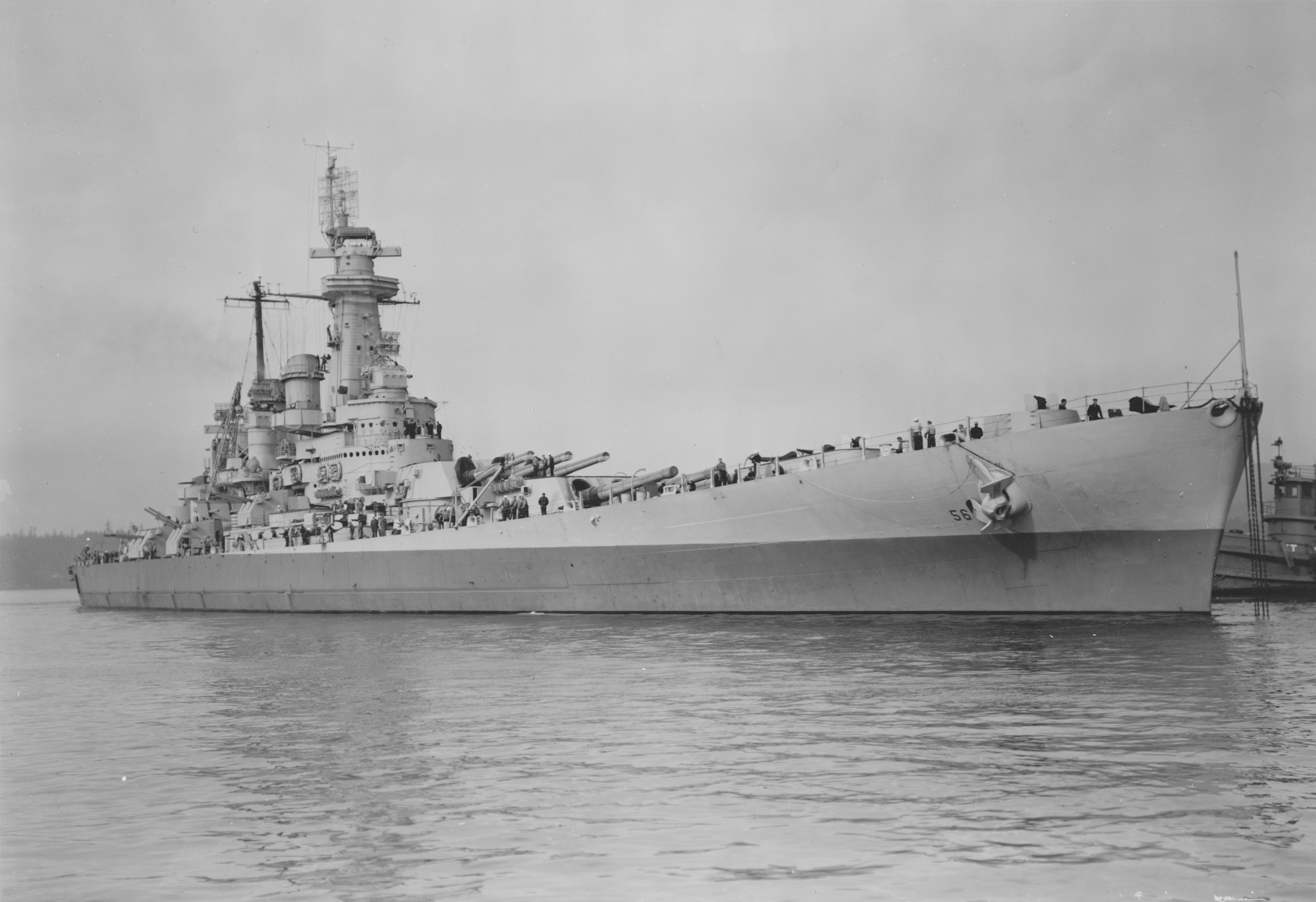 Description: A large battleship floating on top of a body of water next to a boat with people on it and a flag.