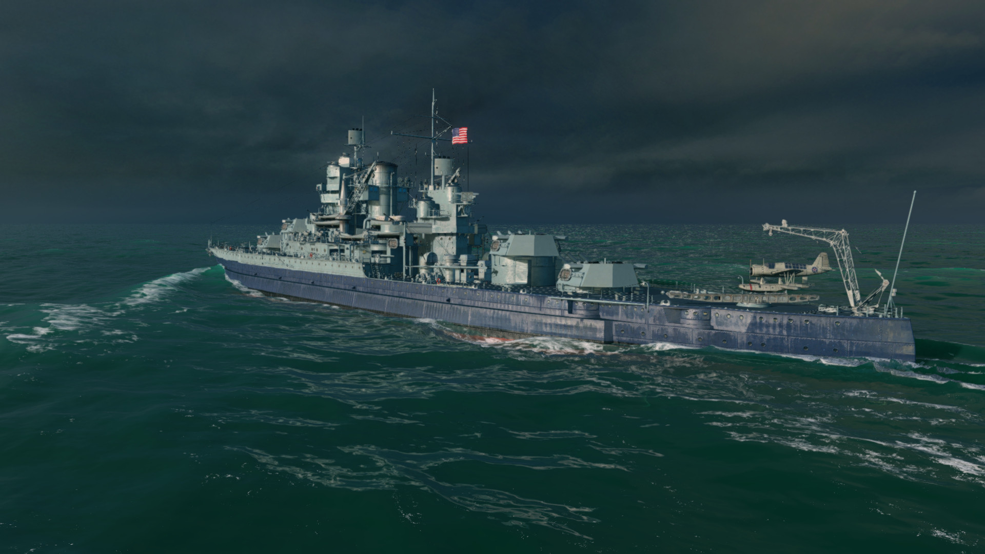Description: A large battleship floating on top of a body of water under a cloudy sky with a flag on it.