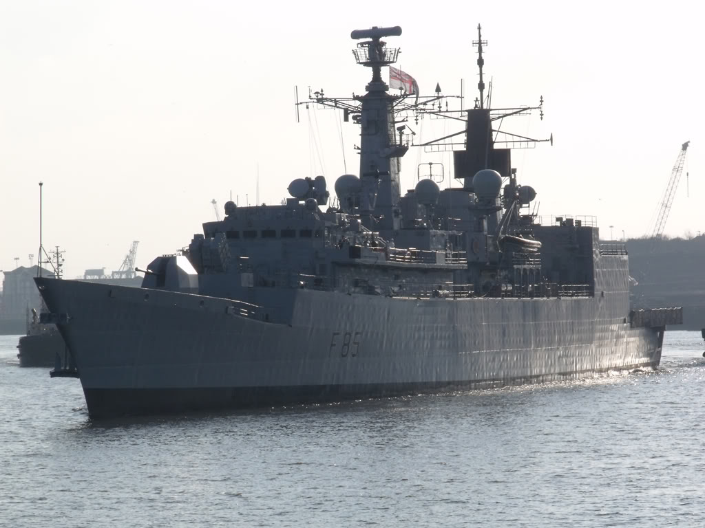 Description: A large battleship floating on top of a body of water next to a dock and a boat in the water.