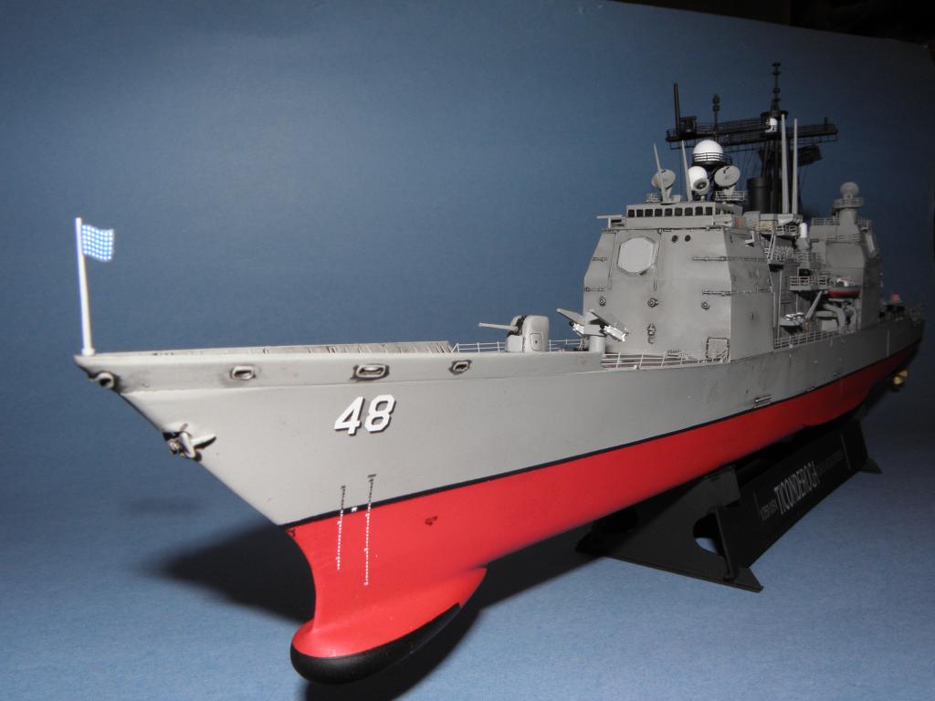 Description: A model of a battleship on a blue background with a flag on top of it and a flag on the bottom of the ship.