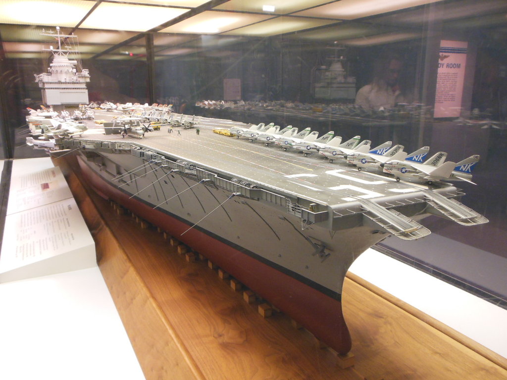 Description: A model of a battleship on display in a museum case with a wooden floor and a glass window behind it.