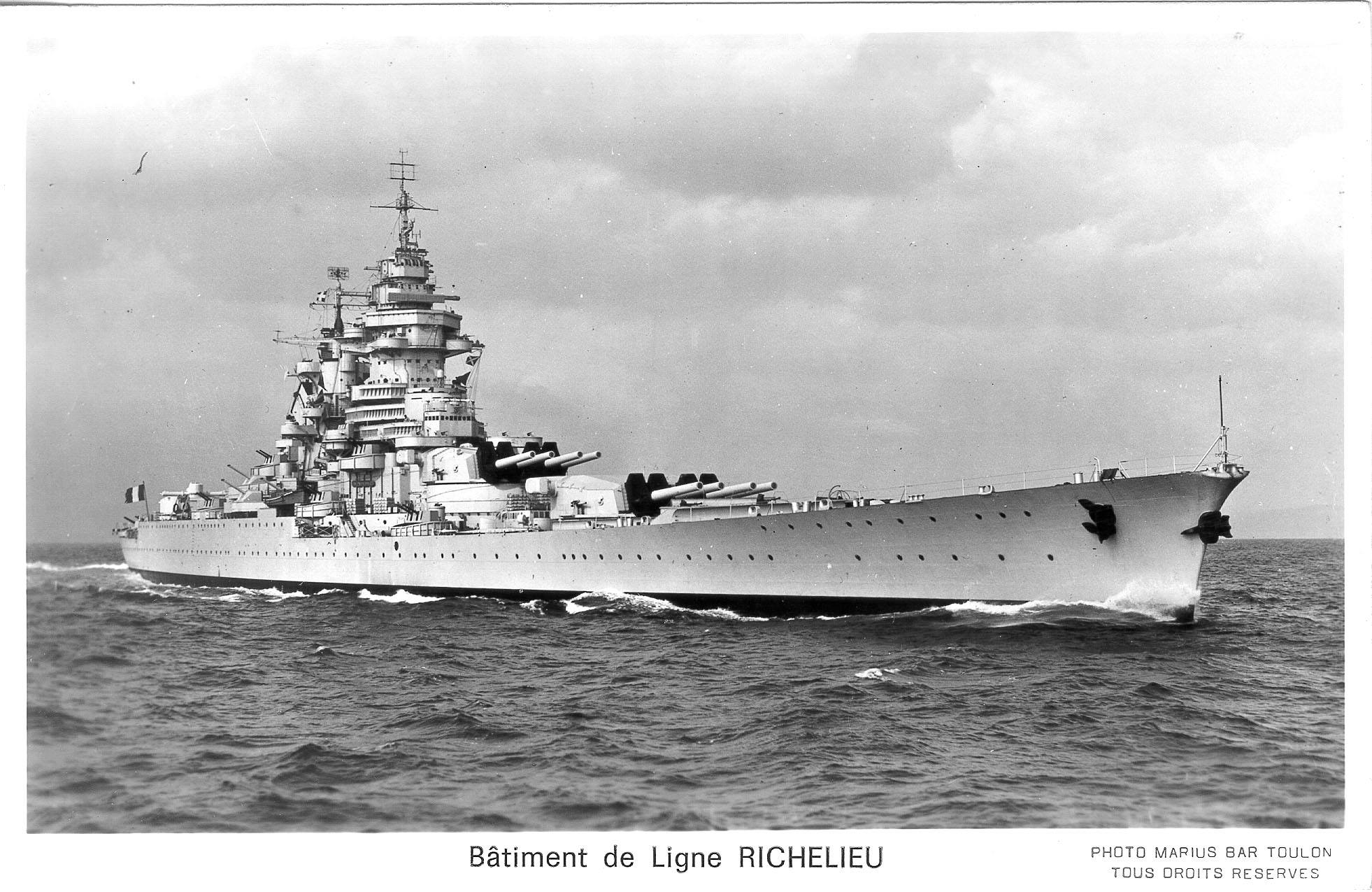 Description: A large battleship in the middle of the ocean with a lot of smaller ships in the background and a few smaller ones in the water.