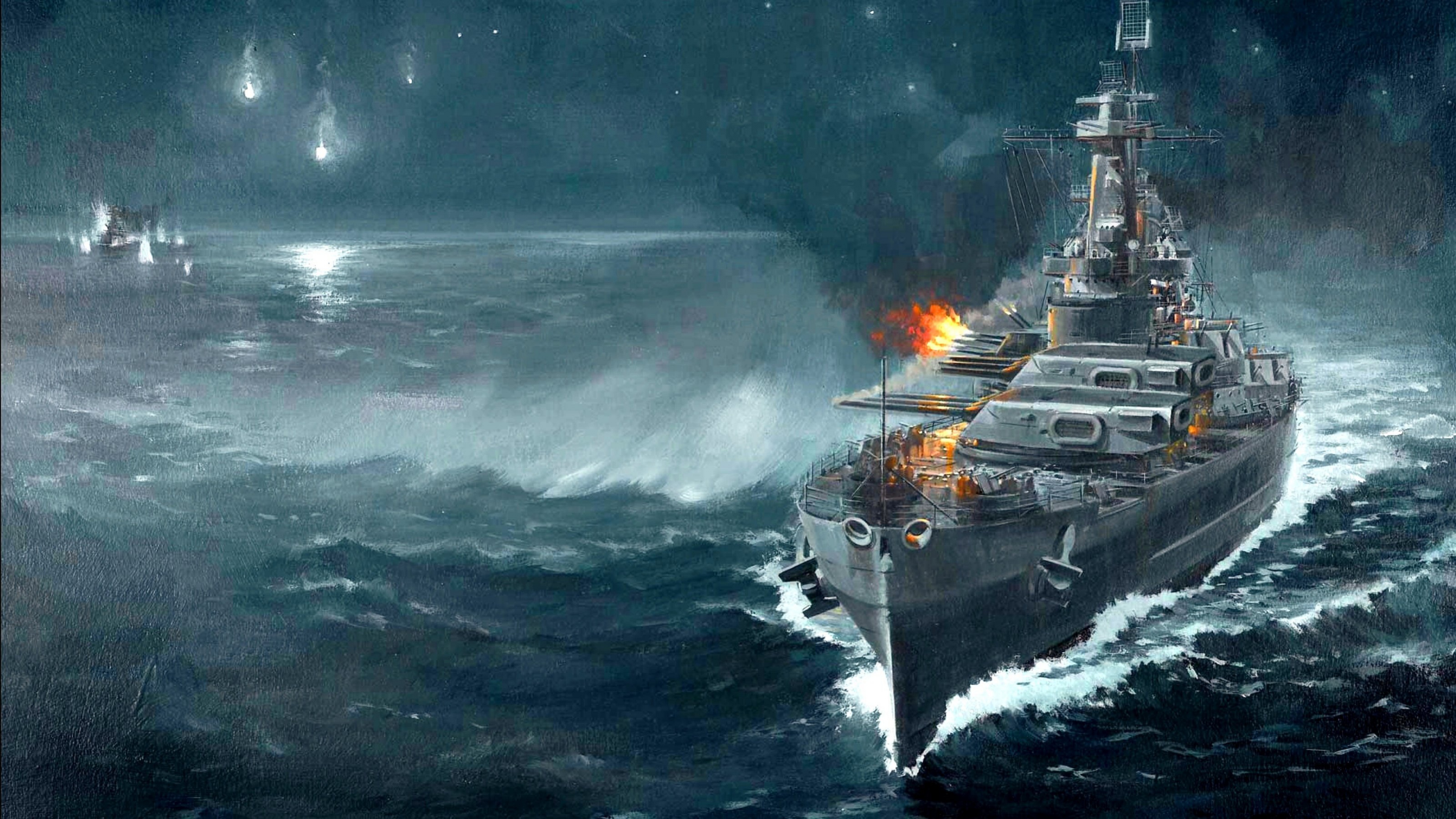 Description: A painting of a battleship in the middle of the ocean with a lot of smoke coming out of it.