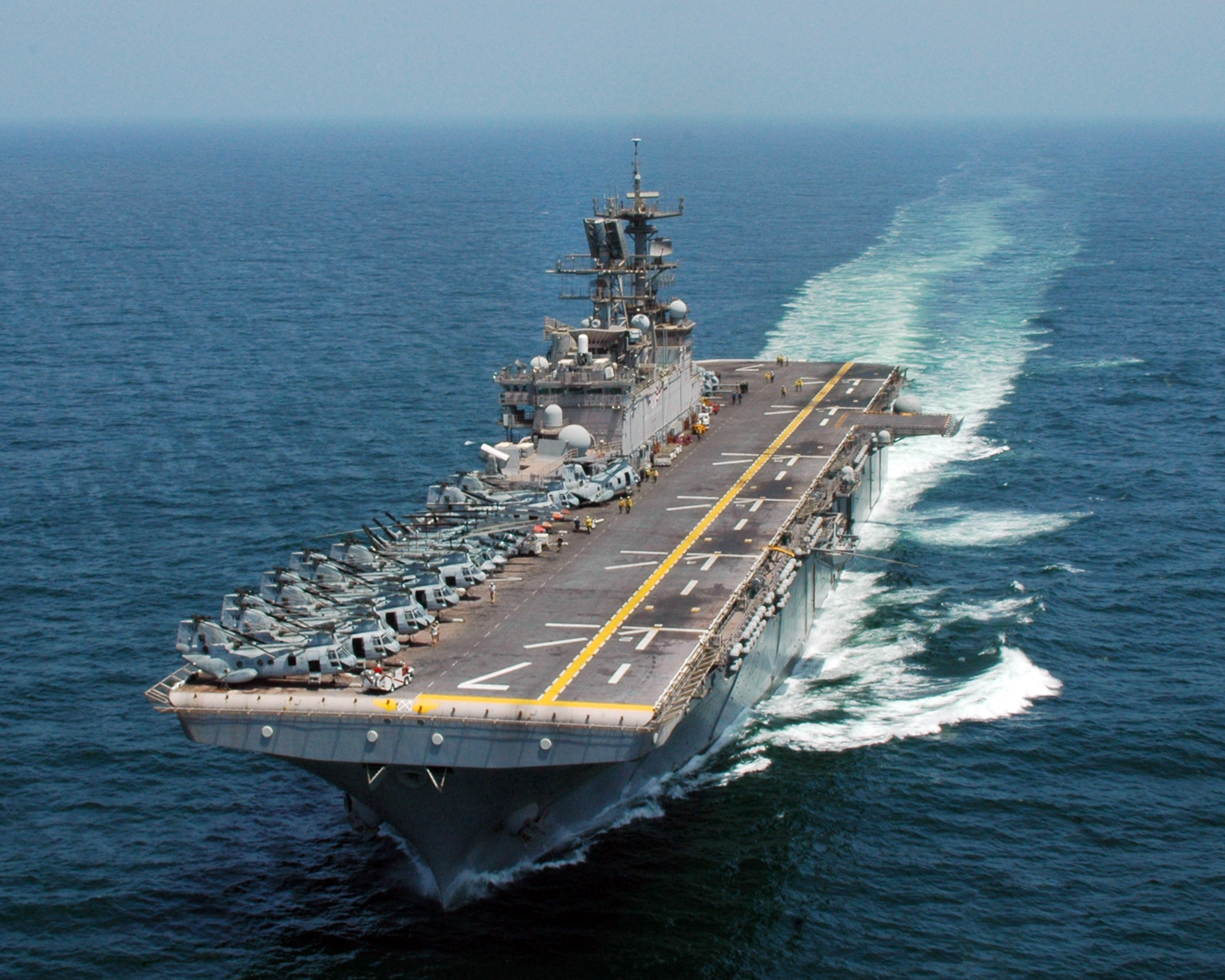Description: A large ship with a lot of guns on it's deck in the water with a boat in the background.