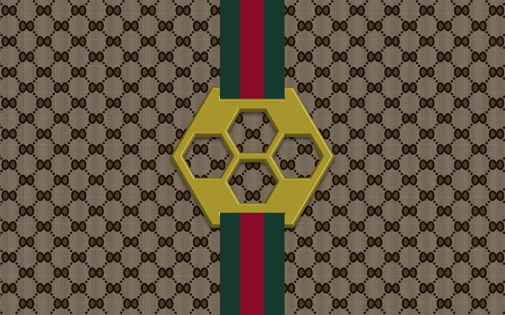 Description: A brown and red striped wallpaper with a hexagonal design on it's side and a green and red stripe on the bottom.