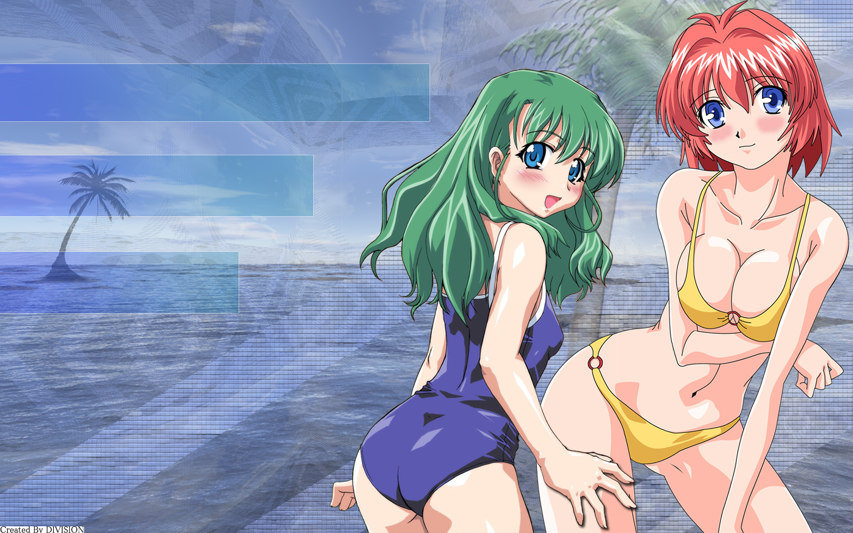 Description: Two anime girls in bathing suits standing next to each other on a beach with palm trees in the background.