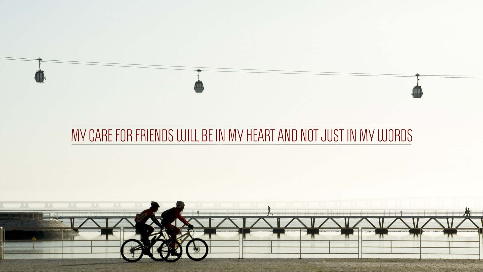 Description: Two people riding bikes on a beach near a pier with a quote above them that reads.