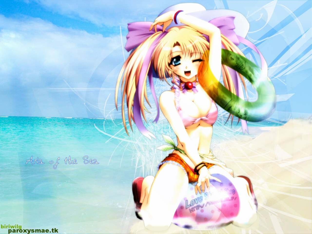 Description: A woman in a bikini sitting on a beach next to the ocean with a green umbrella over her head.