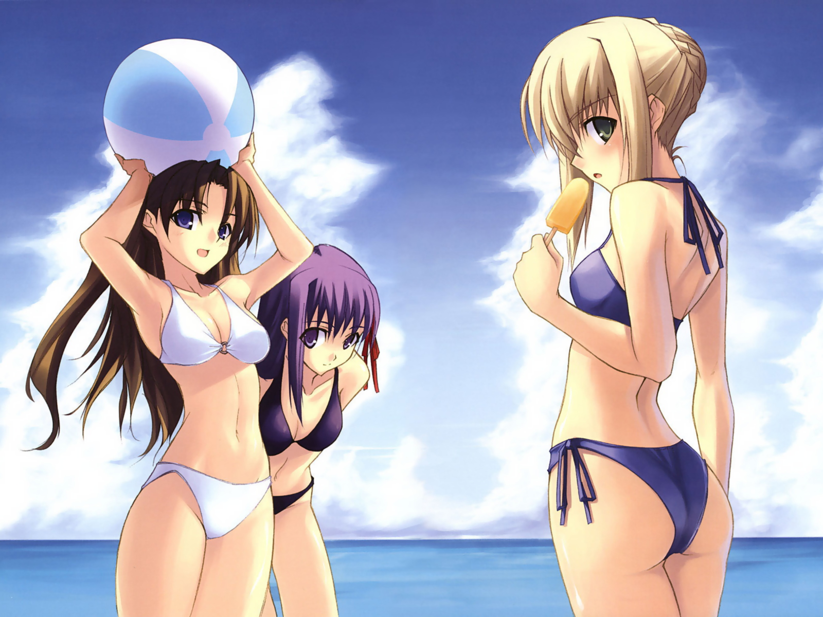 Description: Two women in bikinis standing on the beach with a ball in their hand and one holding a ball in her other hand.