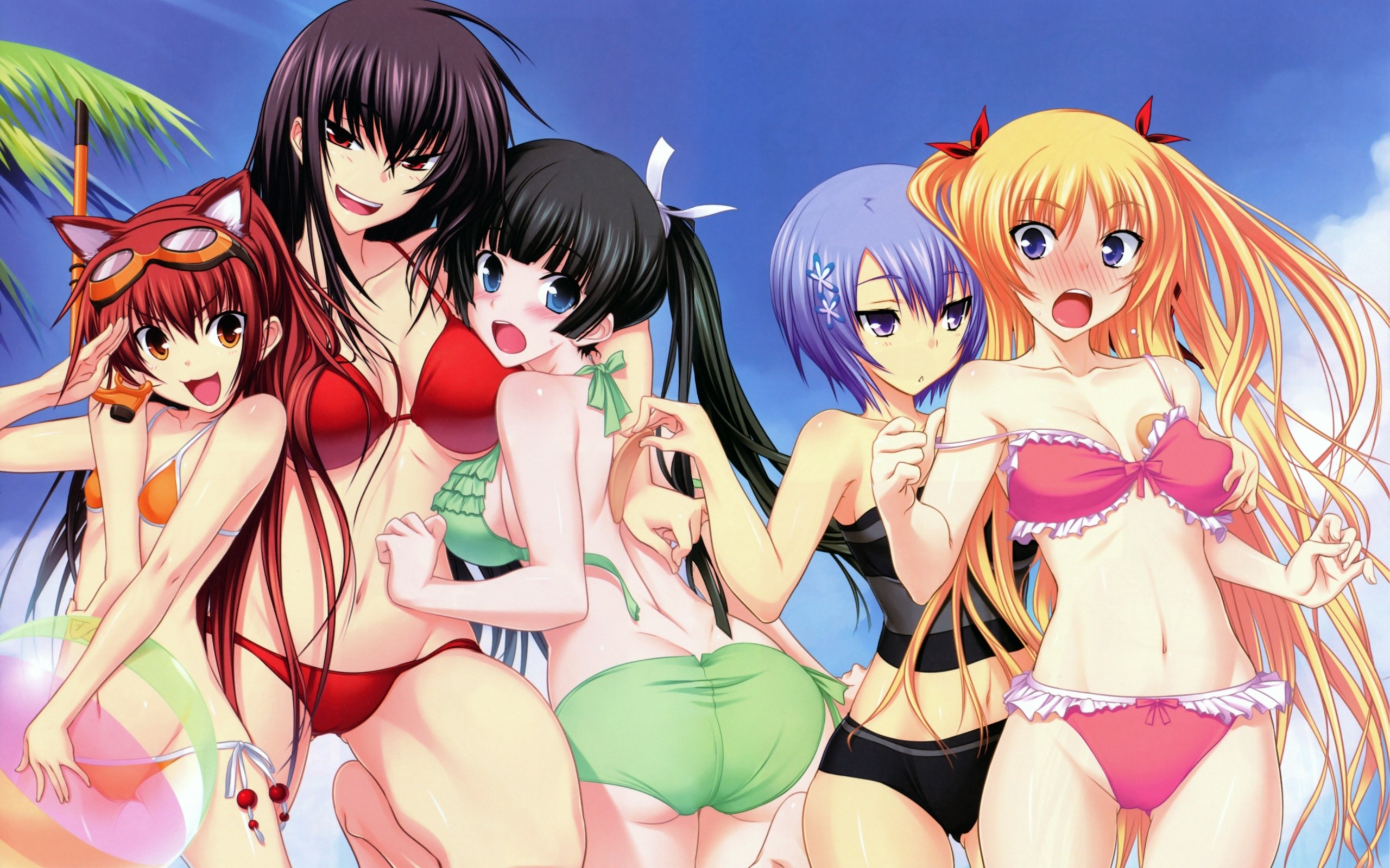 Description: A group of women in bikinis standing next to each other on a beach with palm trees in the background.