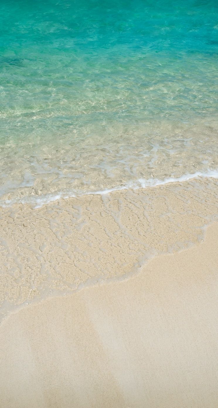 Description: A beach with a blue ocean and a white sand beach with a surfboard on it's side.