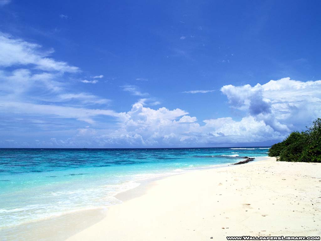 Description: A beach with a blue sky and white sand and water and trees on the shore line and a few clouds.