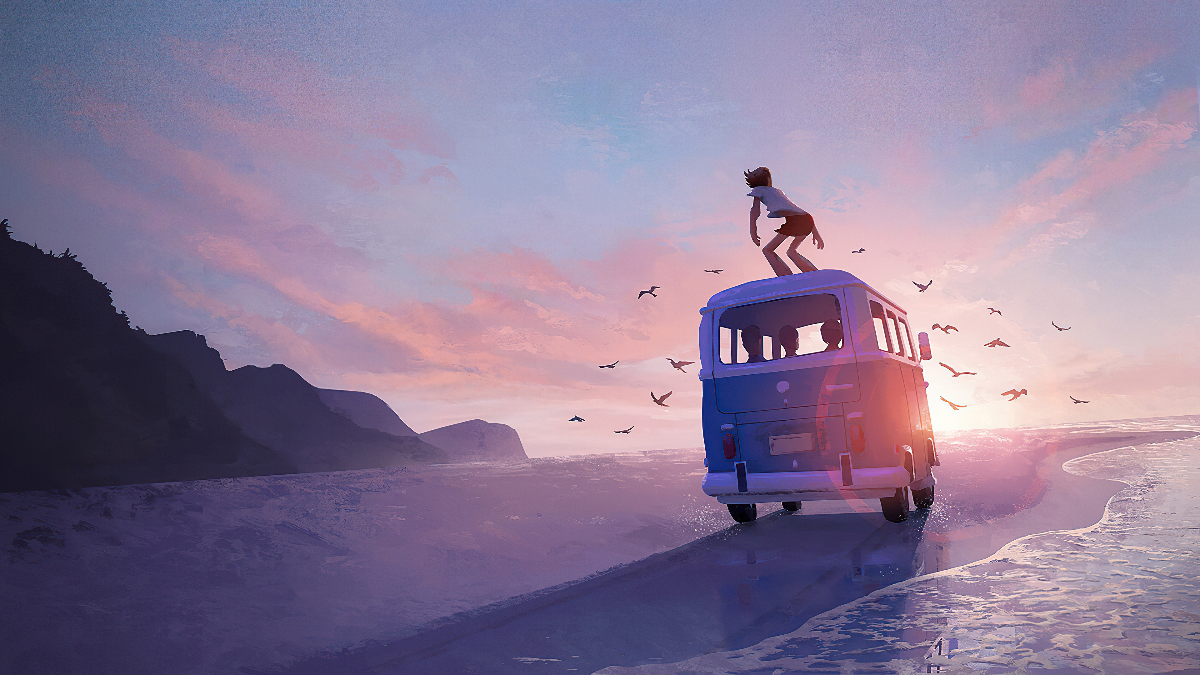 Description: A man standing on top of a bus on the beach with birds flying around him and a woman standing on top of the bus.
