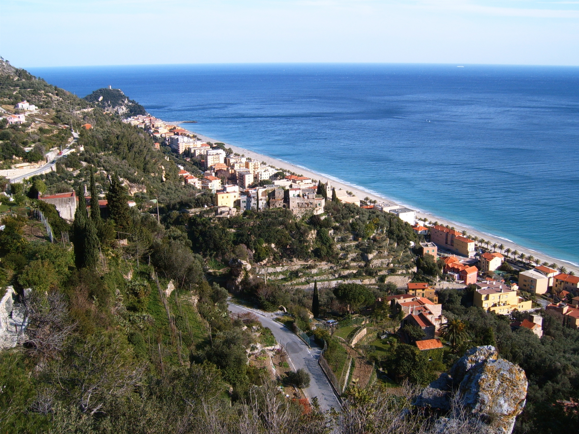 Description: A beach and a city on a hill near the ocean with a blue sky and water in the background.