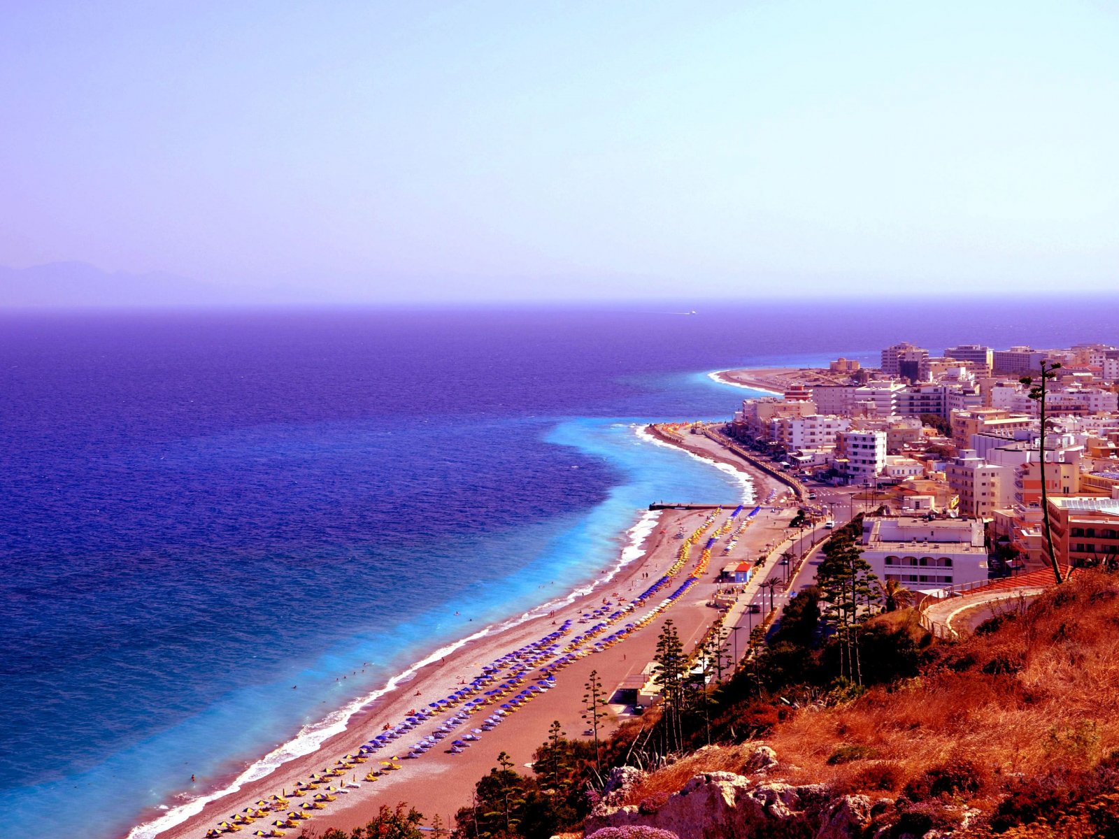 Description: A beach with a bunch of people on it and a city in the background with blue water and a blue sky.