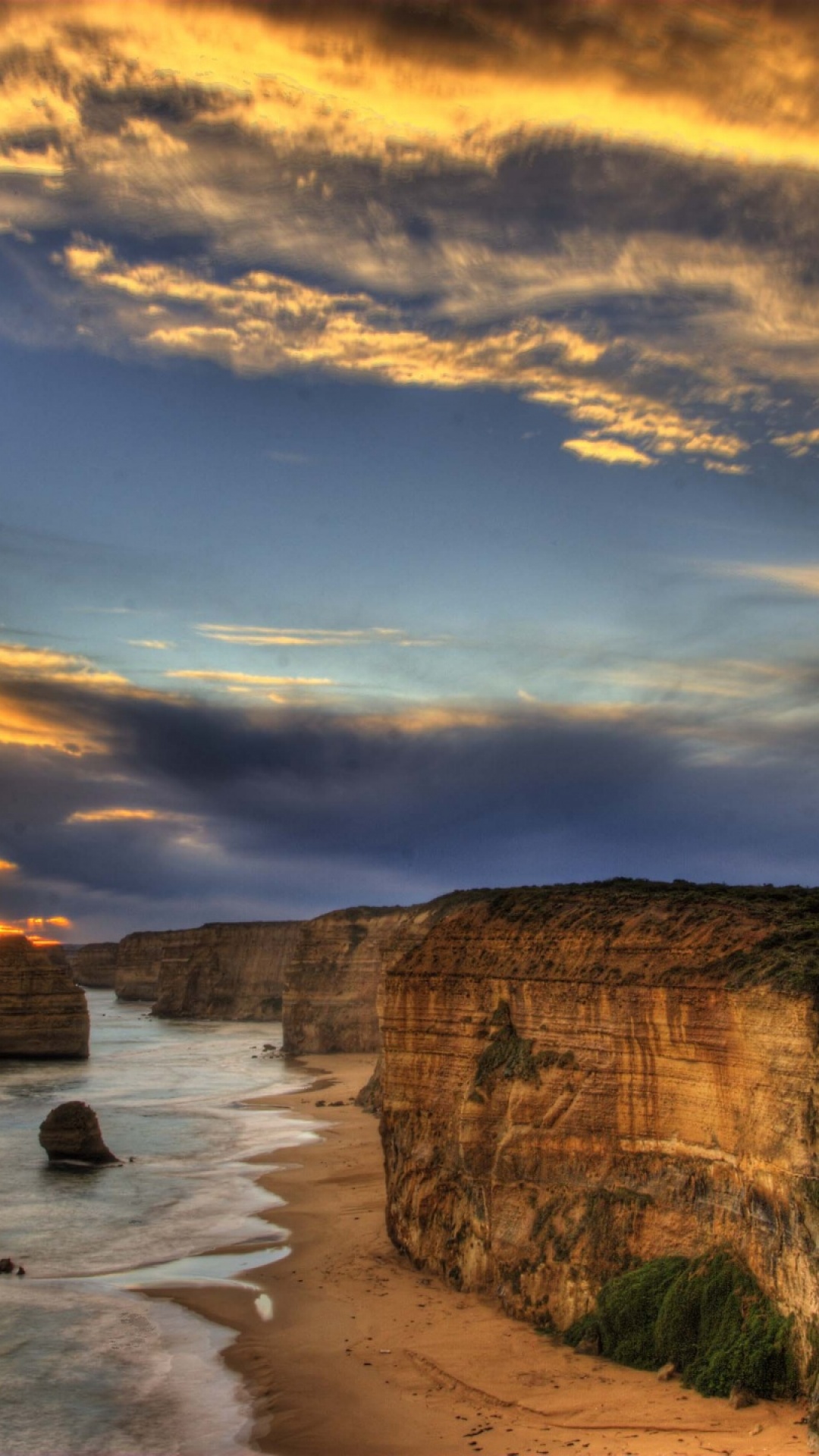 Description: A beach with a cliff and a body of water under a cloudy sky with a lighthouse on top of it.