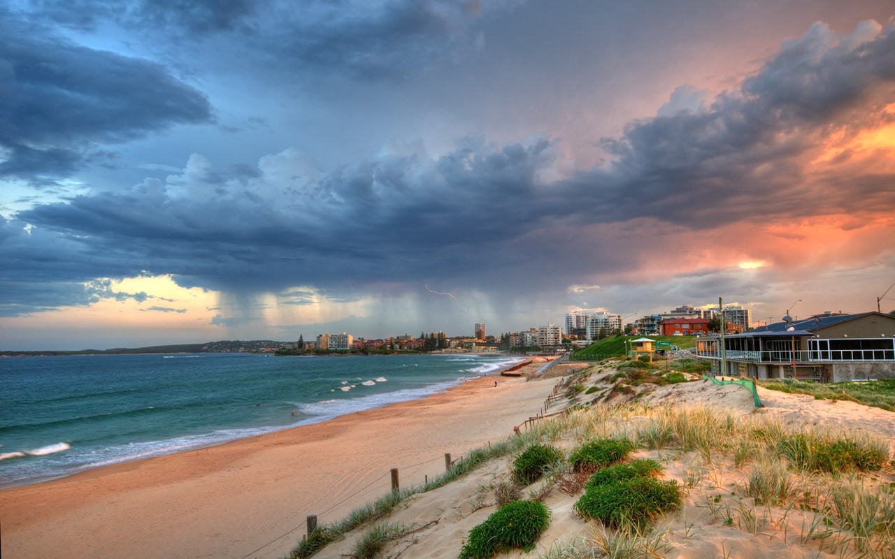 Description: A beach with a cloudy sky and buildings in the background and a beach with grass and bushes on the shore.