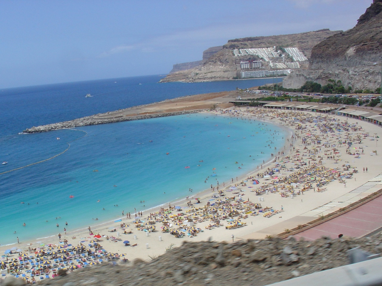 Description: A beach with a lot of people on it and a body of water in the background with a rocky cliff.