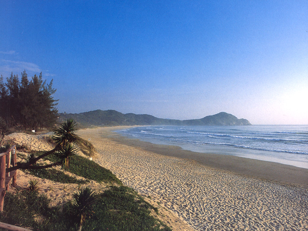 Description: A beach with a fence and a hill in the background and a body of water in the foreground.