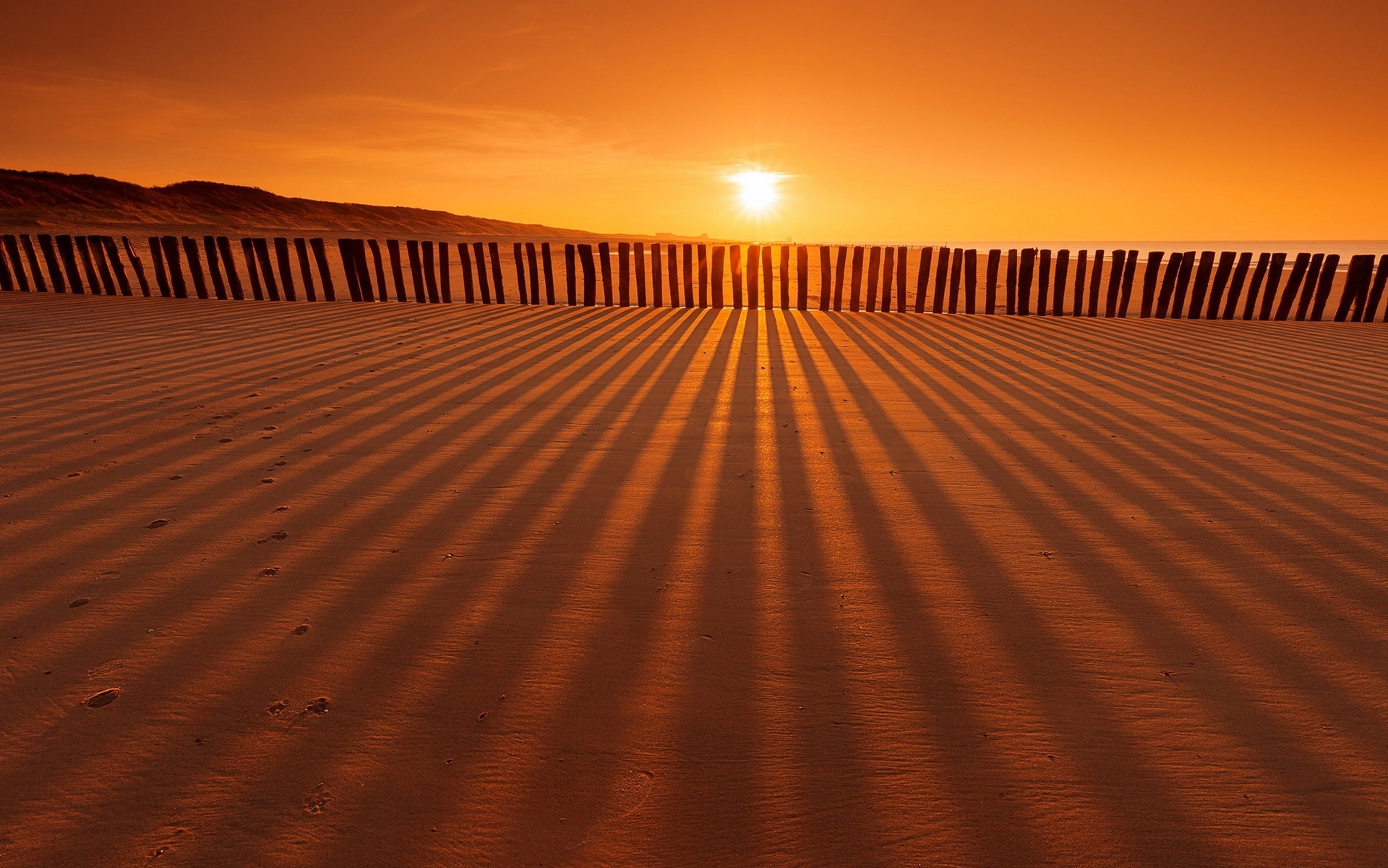 Description: A beach with a fence and a sunset in the background with a person walking on the beach in the sand.