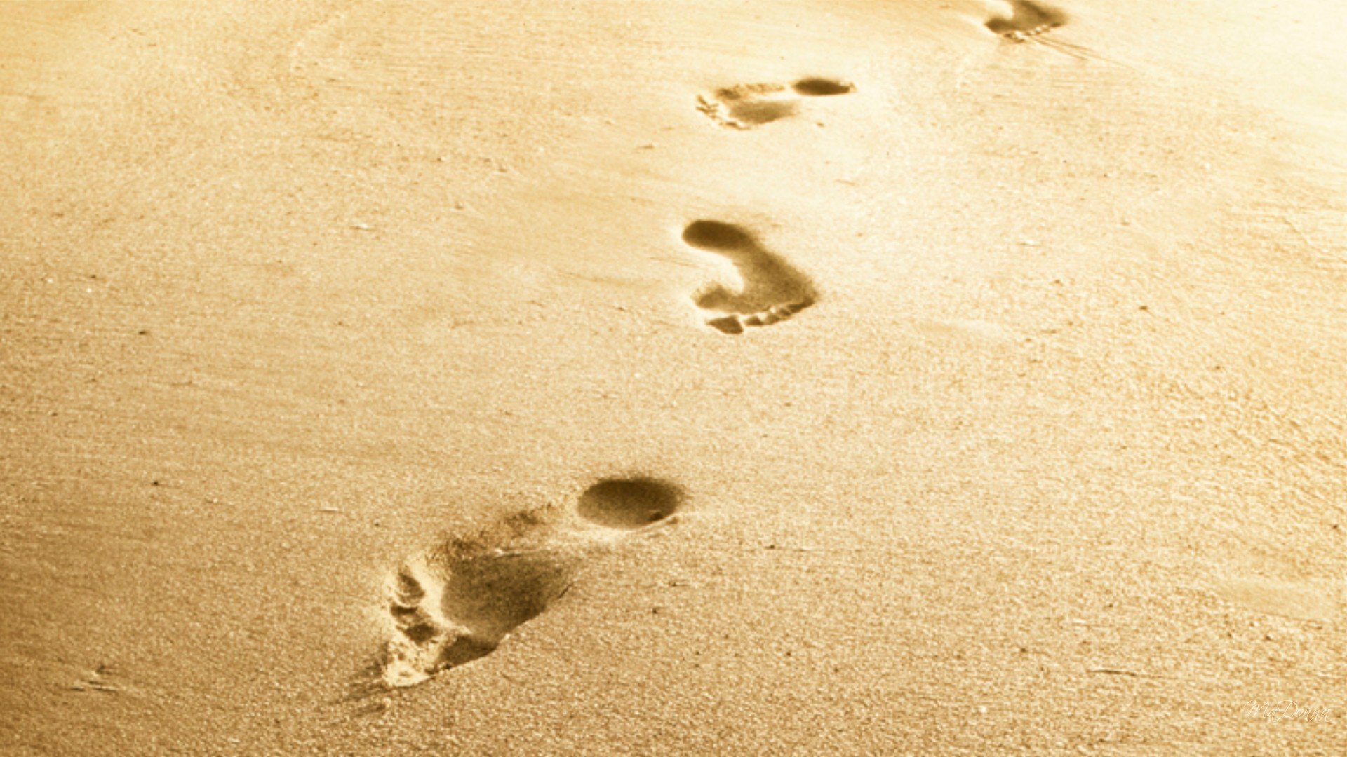 Description: A person walking on a beach with footprints in the sand and a surfboard in the sand behind them.