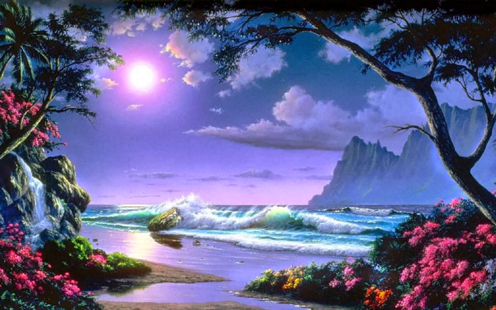 Description: A painting of a beach with a full moon and a full moon in the sky above the water and a mountain.