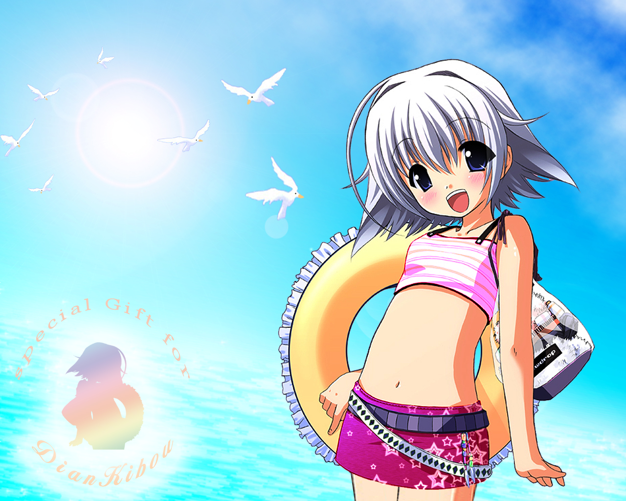 Description: A girl in a bikini standing on a beach with a life preserver in her hand and a bird flying above her.
