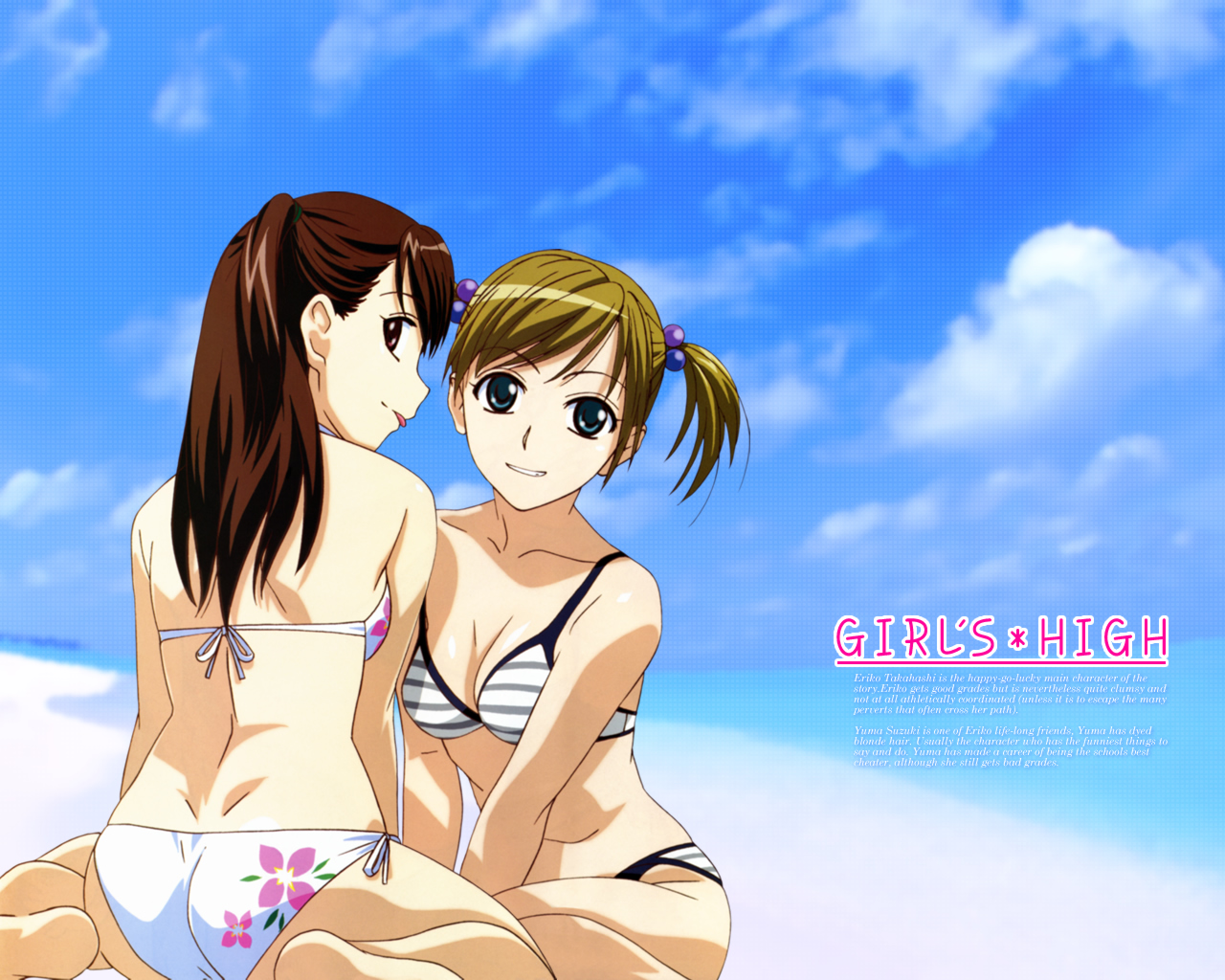 Description: Two girls sitting on the beach in bikinis and one is holding her head back to her chest and the other is looking at her.