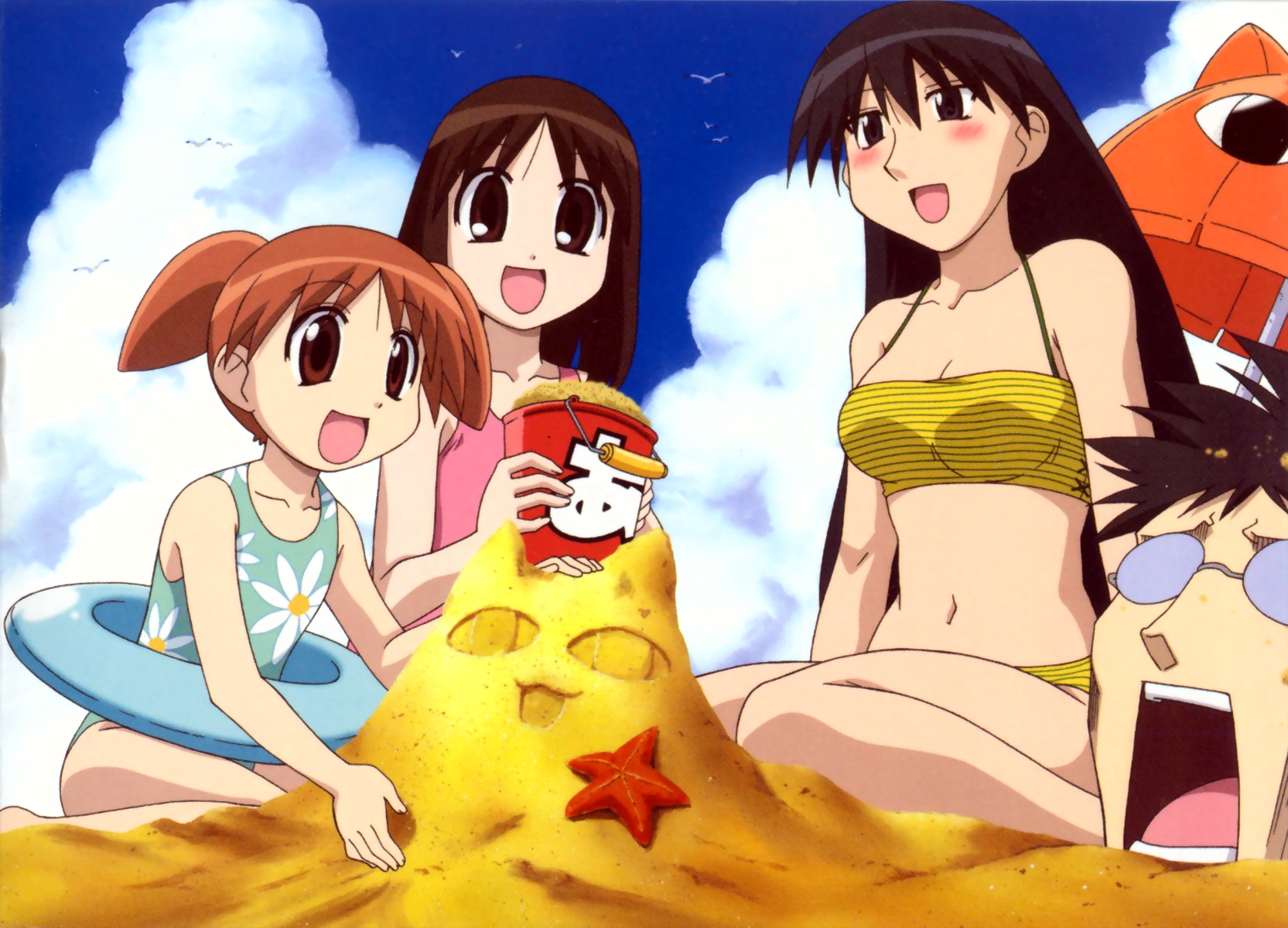 Description: A group of girls sitting on a beach next to a sand castle with a hello kitty on it and a hello kitty on top.