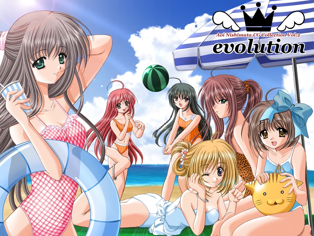 Description: A group of women sitting on top of a beach next to the ocean with a blue umbrella and a blue and white striped umbrella.