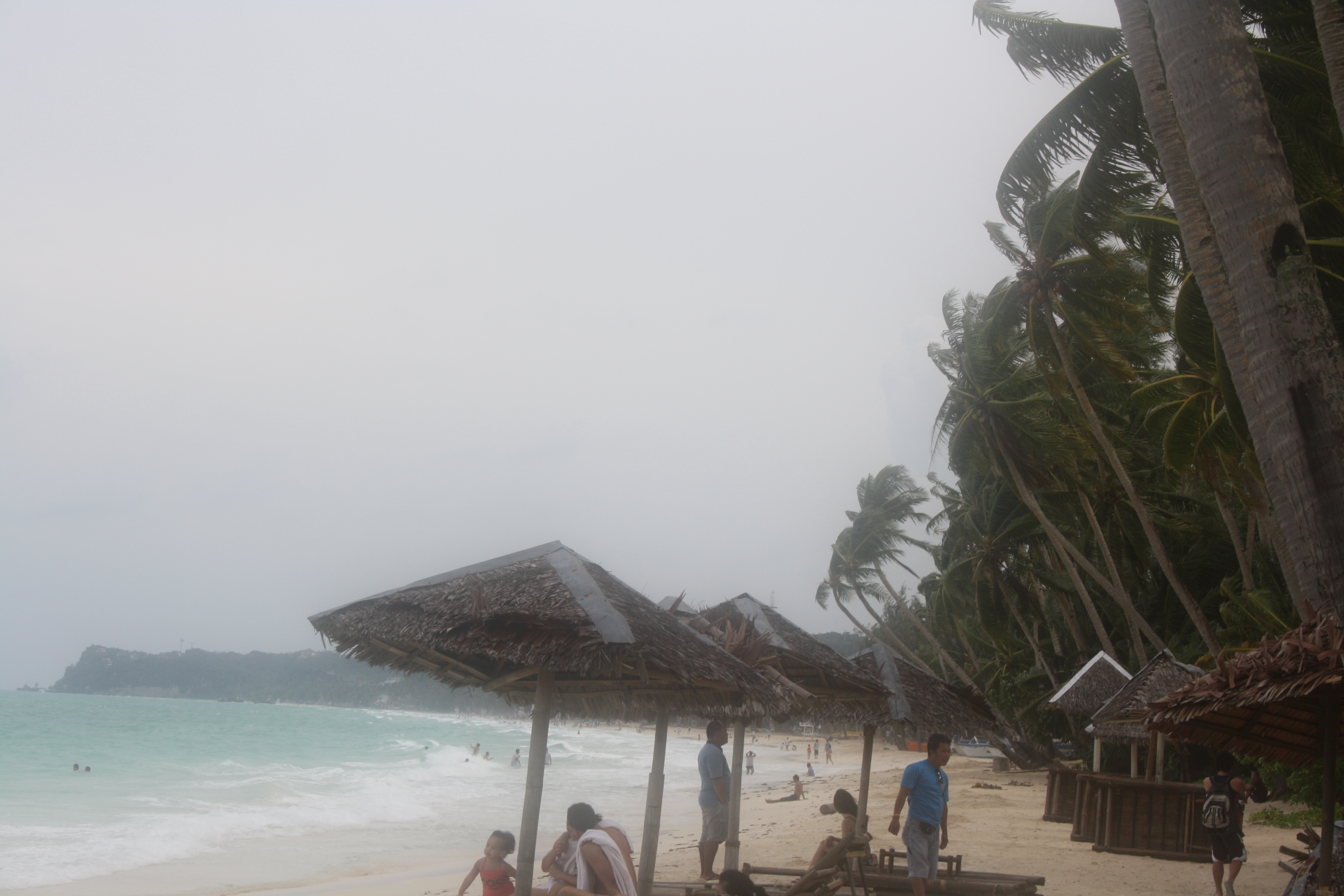 Description: A group of people standing on top of a sandy beach next to the ocean with palm trees in the background.