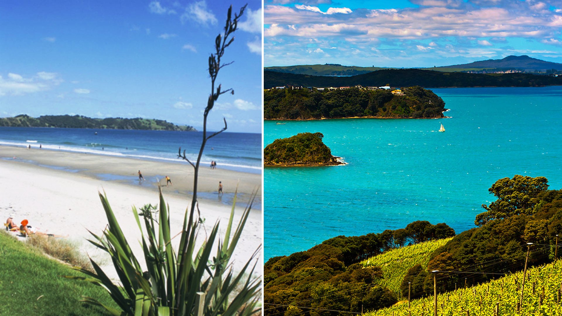 Description: A beach with a few people on it and a grassy hill with a tree in the foreground and a blue ocean with a few people on the other side.