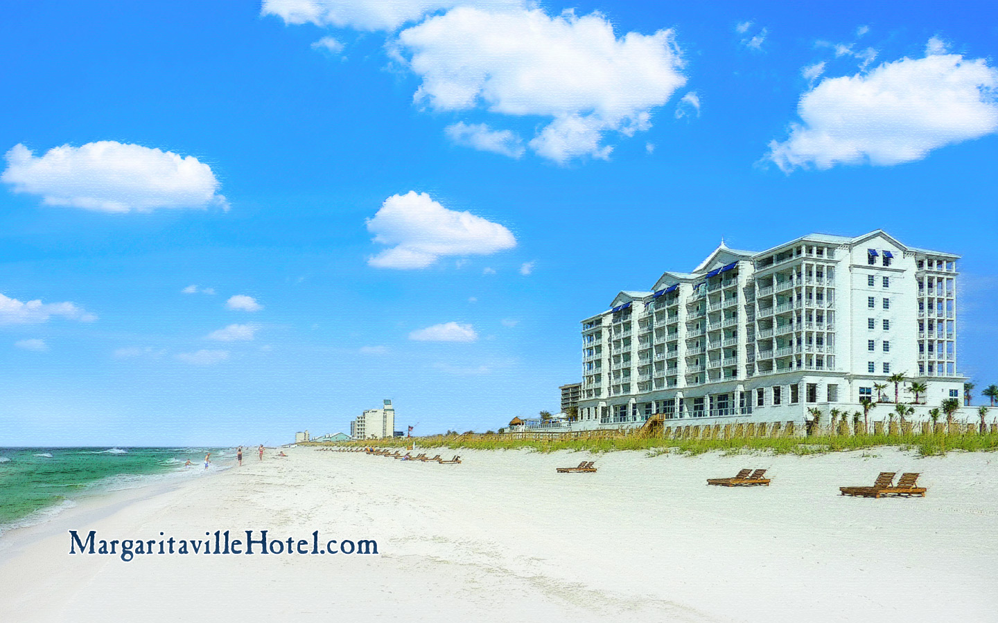 Description: A beach with a hotel and chairs on it and a blue sky with clouds above it and a beach in the foreground.