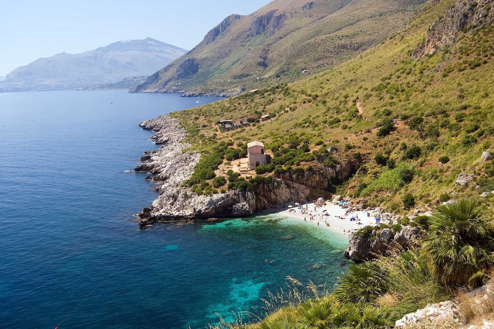 Description: A beach with a house on the cliff above it and a body of water below it with a mountain in the background.