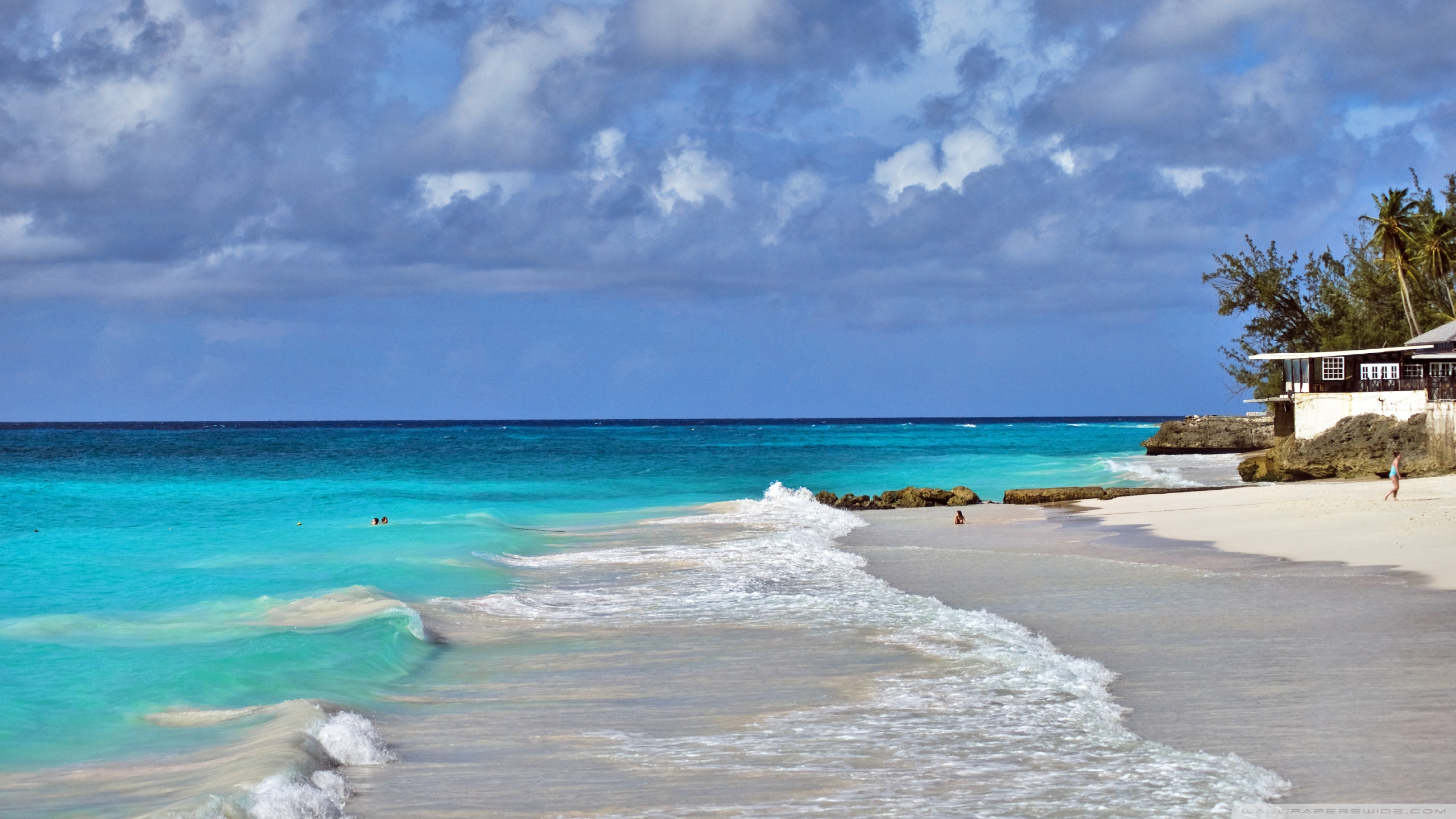 Description: A beach with a house and a body of water in the background and a cloudy sky above it with people walking on the beach.